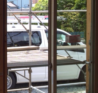 他にもドアがついているのですが、足場と干渉するので勝手口のドアやテラスドアはまだ開けることができません。